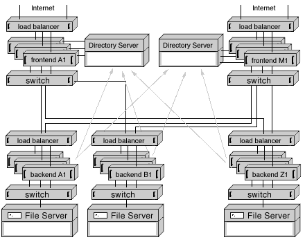Frontend Сервера могут быть объединены в группы для сегментации трафика. Каждая группа может иметь свой собственный балансировщик(и) нагрузки и коммутатор, который соединяет эту Frontend Группу с каждым Backend - Динамическим Кластером.